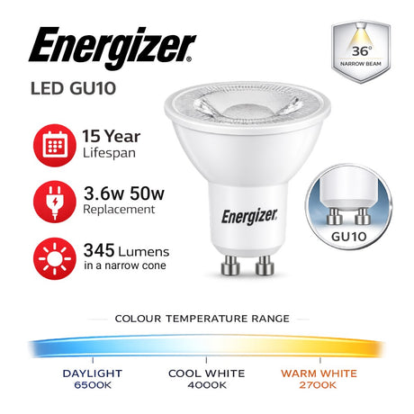 Energizer LED GU10 Bulb 3.6W 345lm – 4000K / 6500K (Cool White / Daylight)